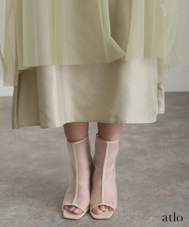 スカート部分はチュール素材で切り替え、ふんわりとしたAラインで女性らしい雰囲気に。