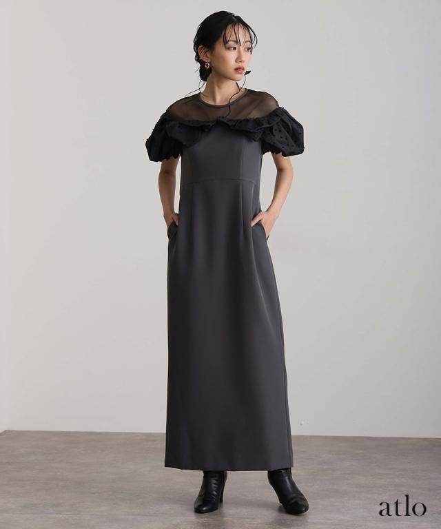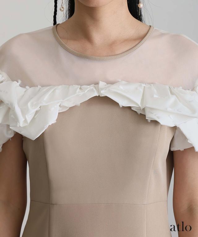 オフショル風に広めに開いたデコルテは、首元をすっきりと見せつつ抜け感も演出し、肩からかかるラッフルが気になる二の腕をさりげなくカバーしてくれます。