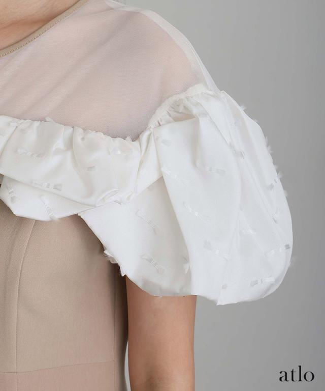 リボンモチーフのカットが特徴的なジャガードタフタを使用した、モード感のある一着。