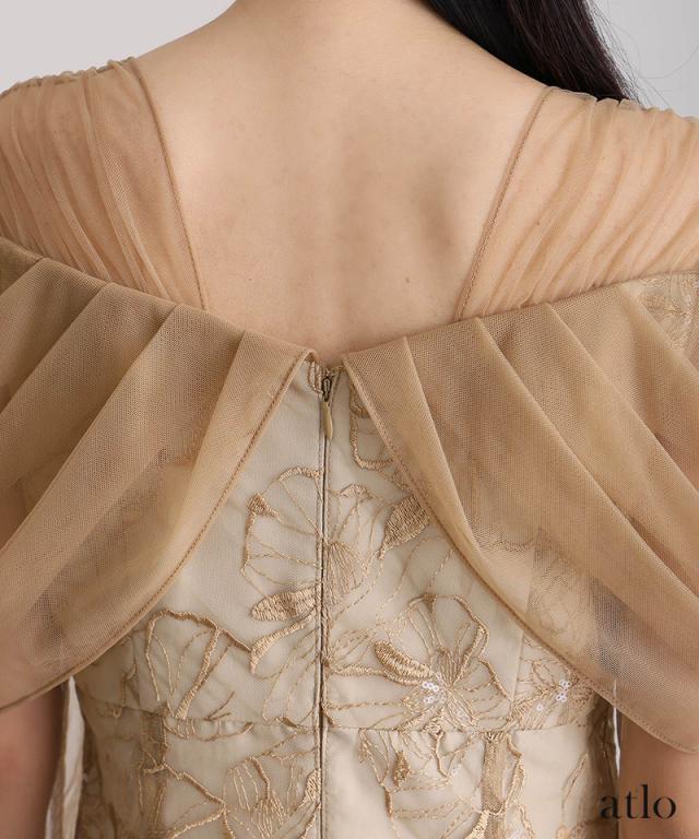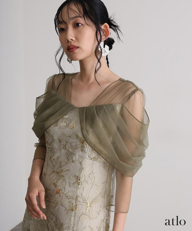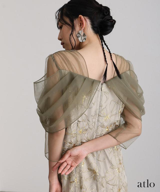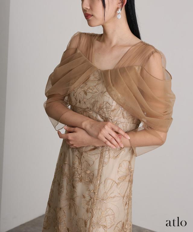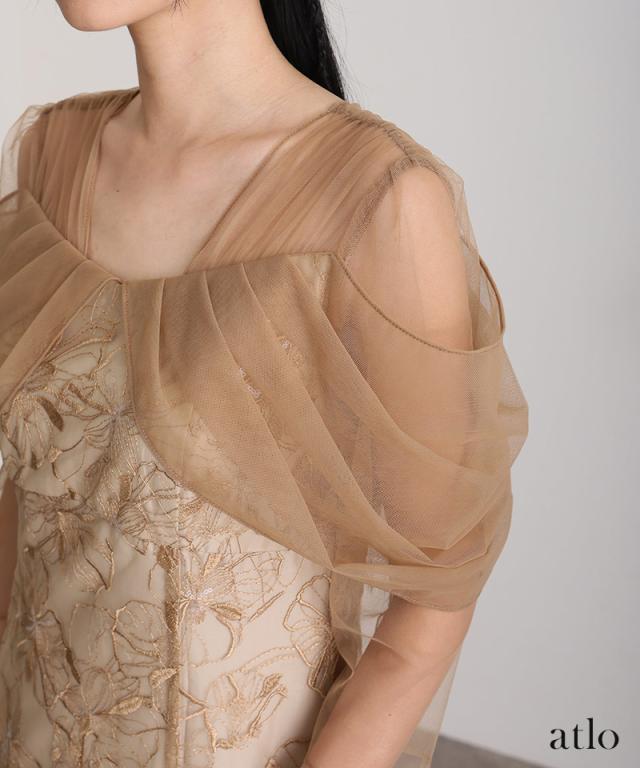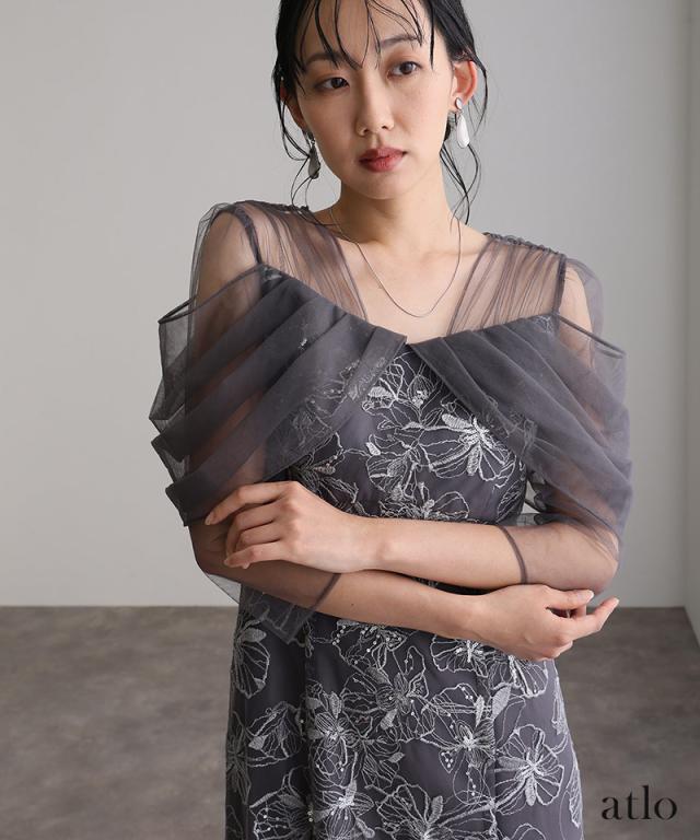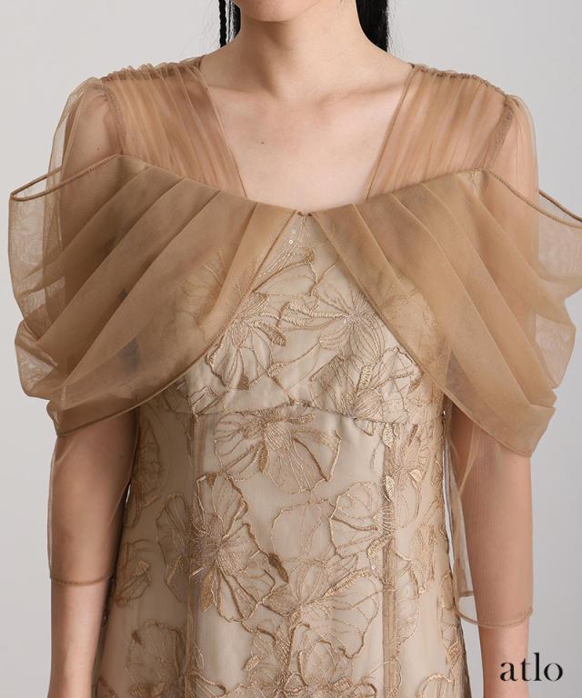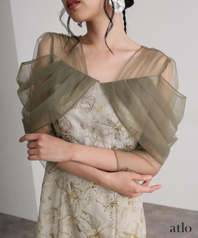 肩周りやお袖にかけて、美しい透け感のあるチュール素材を使用。