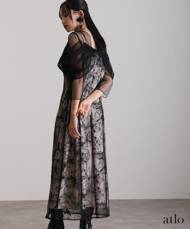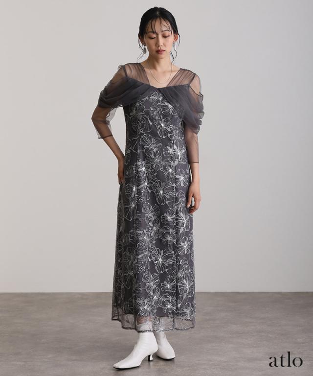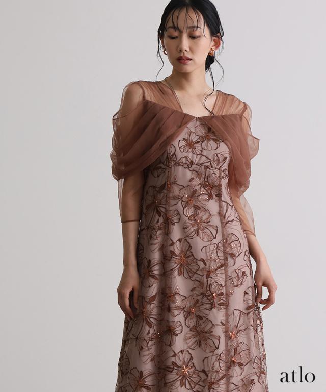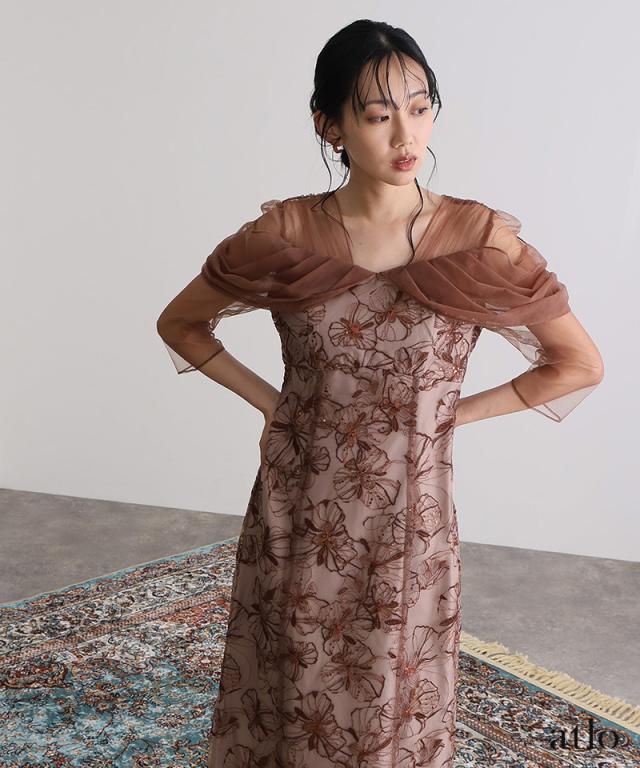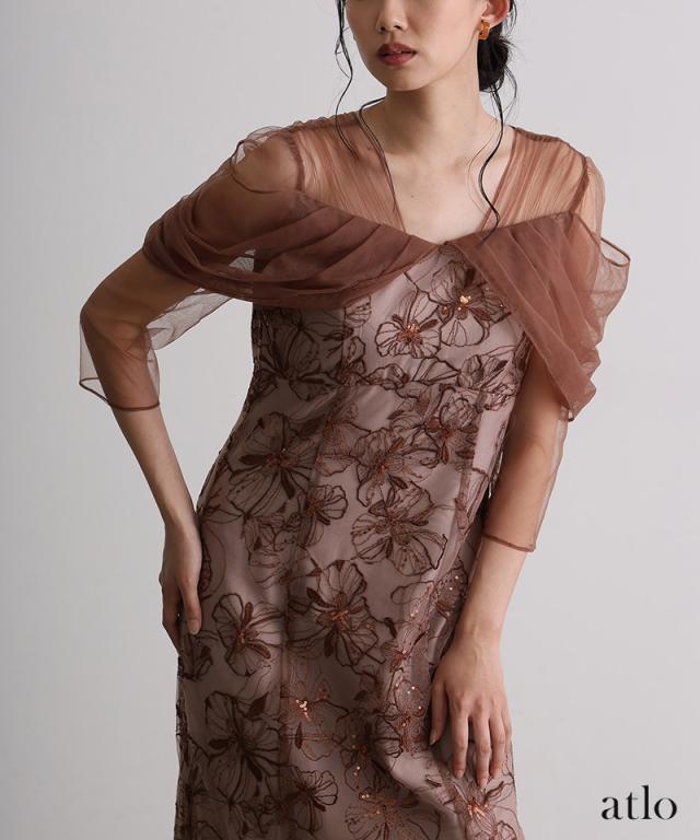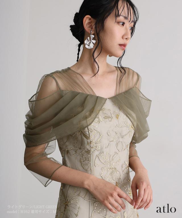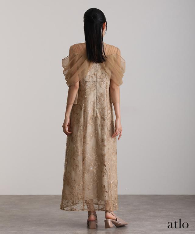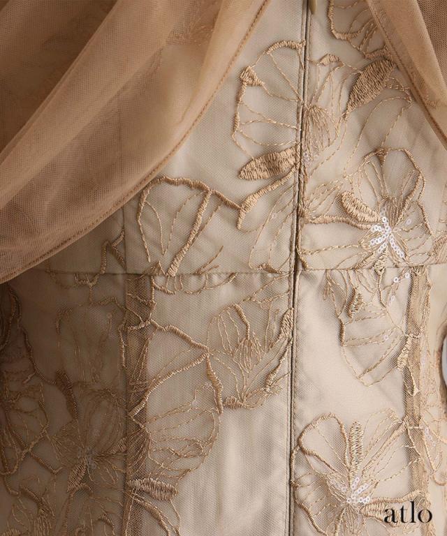 肩周りやお袖にかけて、美しい透け感のあるチュール素材を使用。
