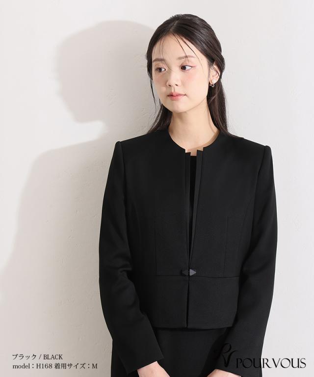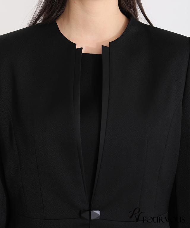 首元を美しく見せるノーカラーデザインとフロントタックが上品な雰囲気を演出。