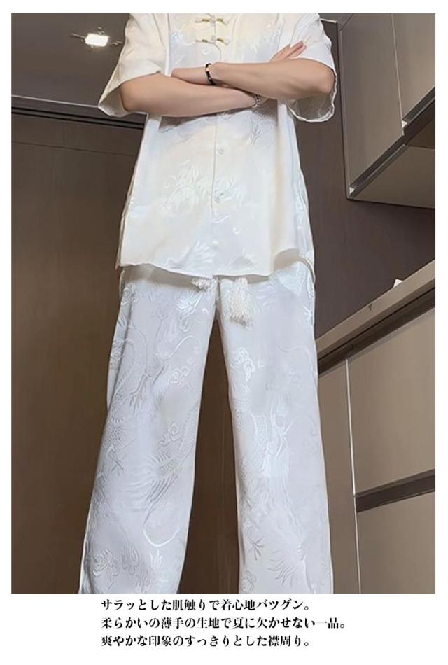 カンフーシャツ 龍柄 上下 チャイナボタン チャイナ服 半袖 接触冷感 チャイナシャツ ルームウェア セットアップ ロングパンツ 涼しい 上下セット カジュアルシャツ 演舞服 UVカット ダンス メンズ 普段着 部屋着 太極拳 唐装 接触冷感 男性用 父の日 春 夏