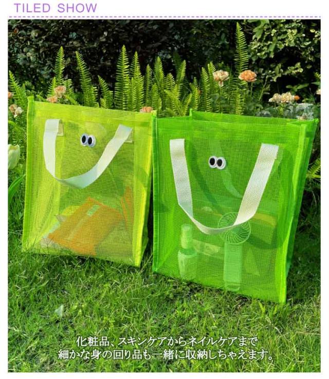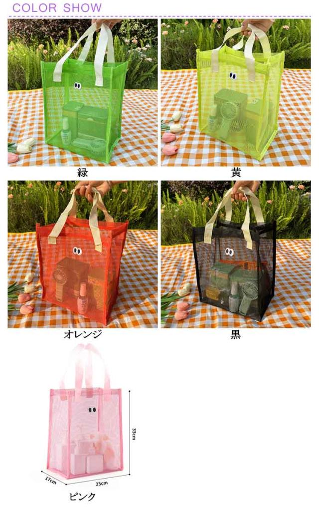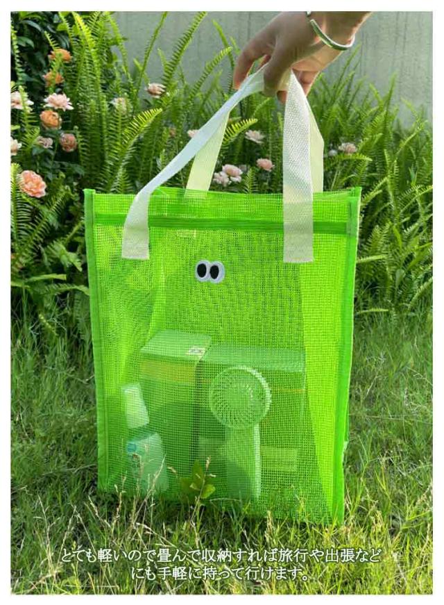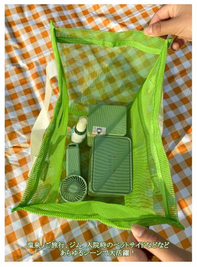 | メッシュで通気性がバツグンなメッシュトートバッグです。 化粧品、スキンケアからネイルケアまで細かな身の回り品も一緒に収納しちゃえます。 とても軽いので畳んで収納すれば旅行や出張などにも手軽に持って行けます。 温泉、ご旅行、ジム、入院時のベットサイドなどなどあらゆるシーンで大活躍! | |
