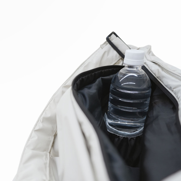 内側にペットボトルホルダーを付け、サイドのポケットにも 500ml ペットボトルも収納可能です。