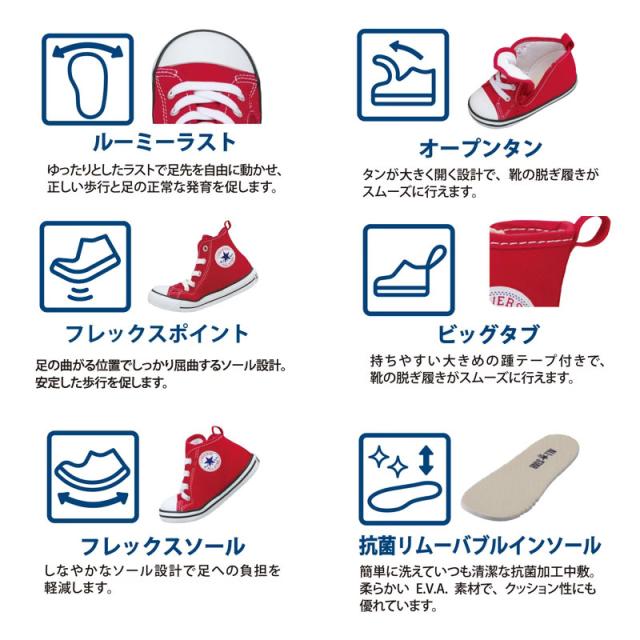 ベビーの足に嬉しい安心機能を搭載し、大人のオールスターをアレンジ。