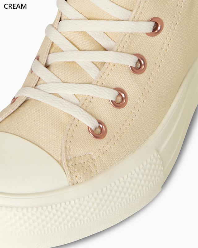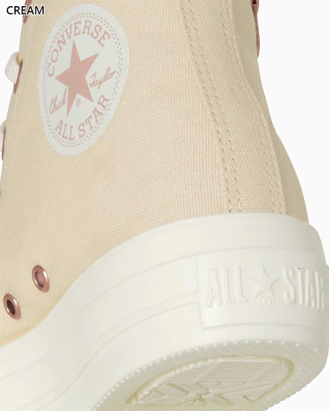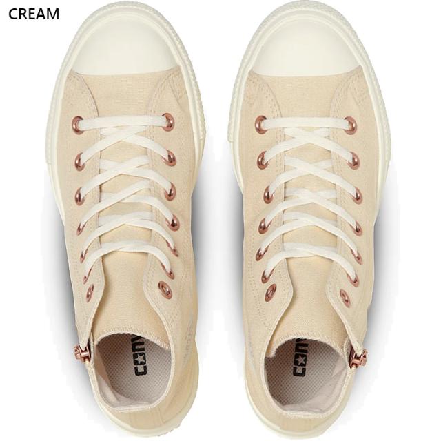 人気のピンクゴールドをハトメやジッパー、アンクルパッチに採用したオールスター。 通常のオールスターより10ミリ高いソール設計の厚底、軽量モデル。