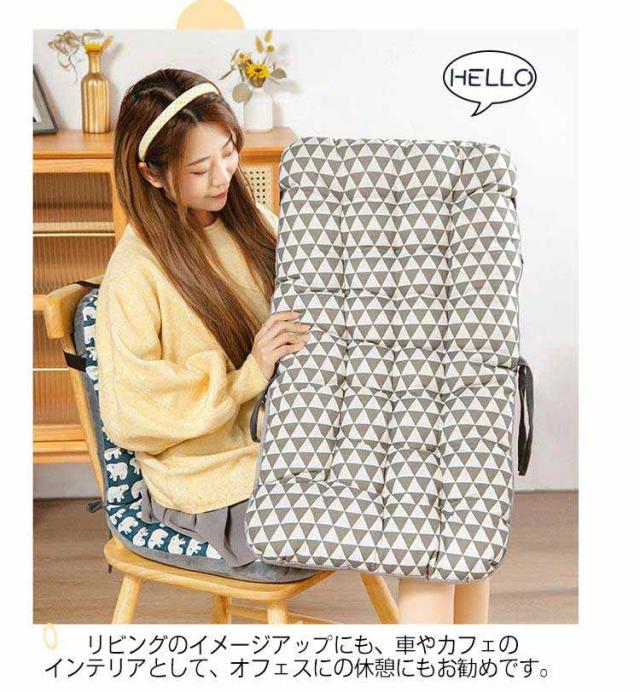 | 【背もたれ付きクッション】【33*42*45cm 35*45*57cm】【】 背もたれまでカバーできるロングタイプの椅子用クッション 表地、裏地もお使いいただける両面使用可能タイプ。季節や気分に合わせて、使い方をお選びいただけます。 分厚いクッションを使用しているので長時間座っていてもお尻や腰が痛くなりにくいです。 椅子に結んで固定できるヒモとバックルが付いているのでズレる心配がありません。 リビングのイメージアップにも、車やカフェのインテリアとして、オフェスにの休憩にもお勧めです。 | |