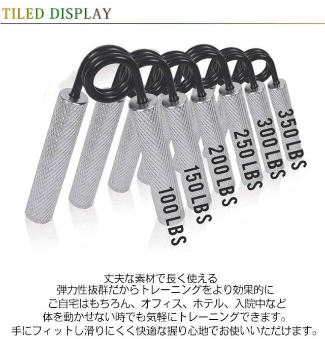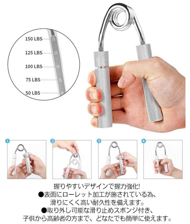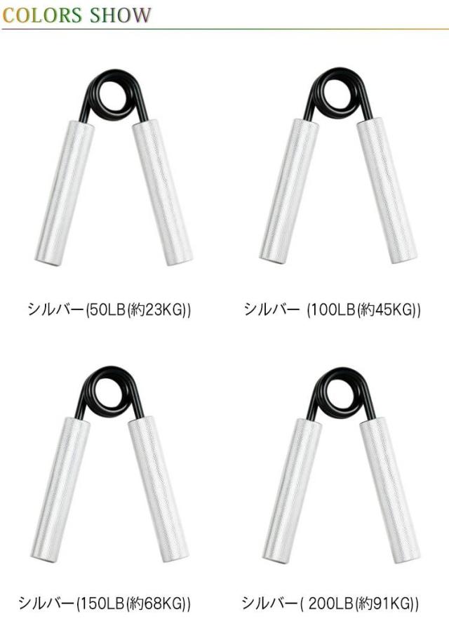 | 50lb−350lb(23kg−159kg) シンプルで握りやすい ハンドグリップ 2色 丈夫な素材で長く使える 弾力性抜群だからトレーニングをより効果的に 握りやすいデザインで握力強化! ●表面にローレット加工が施されている為、 滑りにくく高い耐久性を備えます。 ●取り外し可能な滑り止めスポンジ付き、 子供から高齢者の方まで、どなたでも簡単に使えます。 コンパクトサイズで持ち運び楽々。 握力低下防止やスポーツのためのトレーニングに。 ちょっとイライラしたときや、ヒマつぶしにもピッタリです。 ご自宅はもちろん、オフィス、ホテル、入院中など 体を動かせない時でも気軽にトレーニングできます。 手にフィットし滑りにくく快適な握り心地でお使いいただけます。 | |