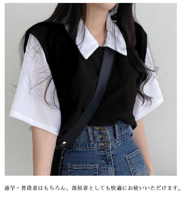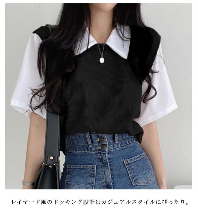 レディース 重ね着風 tシャツ 学生 夏 半袖 シンプル フェイクツーピース 半袖トップス ゆったり プルオーバー スクール 襟付き リラックス 春夏 カジュアル 着回し 普段使い 半袖トップス 通学 ブルー ブラック ベージュ