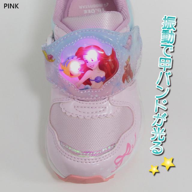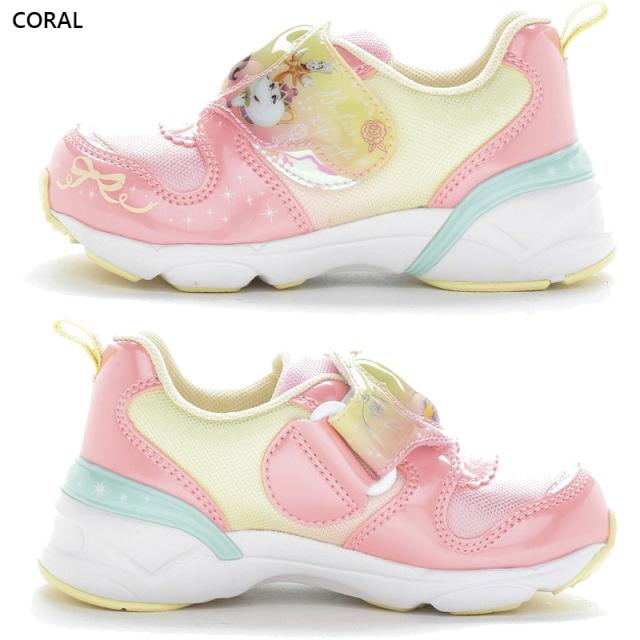 ワンタッチで脱ぎ履きできる一本バンドのジョグタイプです。通園をはじめ、外遊びや運動、お出かけなど、マルチに履いていただけます。甲バンドの発光部分がキャラクターのモチーフを象ったデザインで、おもちゃ感覚の楽しい一足、ピンクは「アリエル」デザインです。コーラルは「ベル」デザインです。パープルは「ラプンツェル」デザインです。