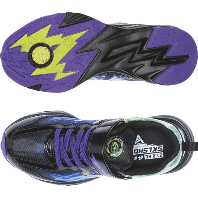 「スキルを解き放て」をコンセプトに子どもたちの多様化するシーンに合わせた「SKL」をアウトソールに搭載しており、踏み込む際の荷重によって「SKL」が発動します。「雷スキル」は雷をモチーフにしたスパイク形状の「SKL」が走る際に発動し、走りをアシストします。脱ぎ履きしやすいゴム紐×バンドタイプです。踵からつま先に突き抜けるイナズマグラフィックが派手でカッコいい商品です。