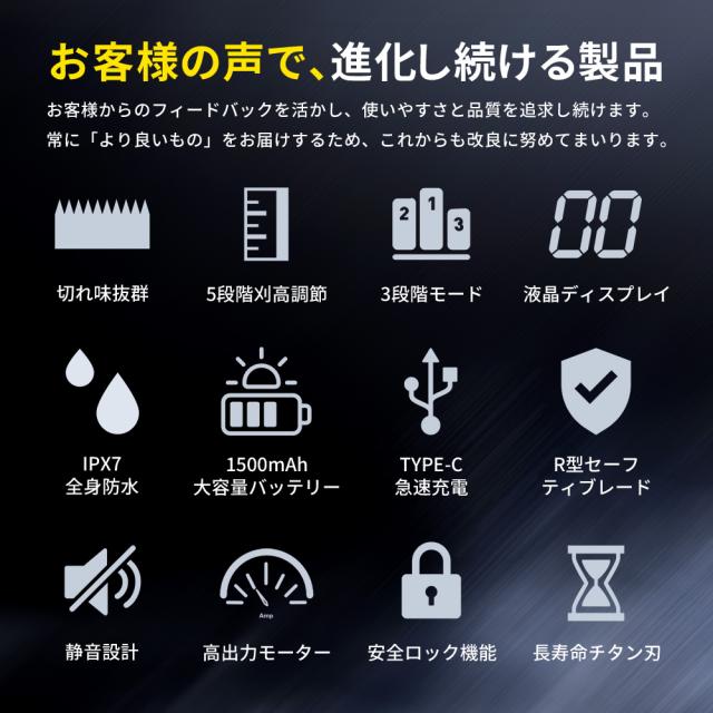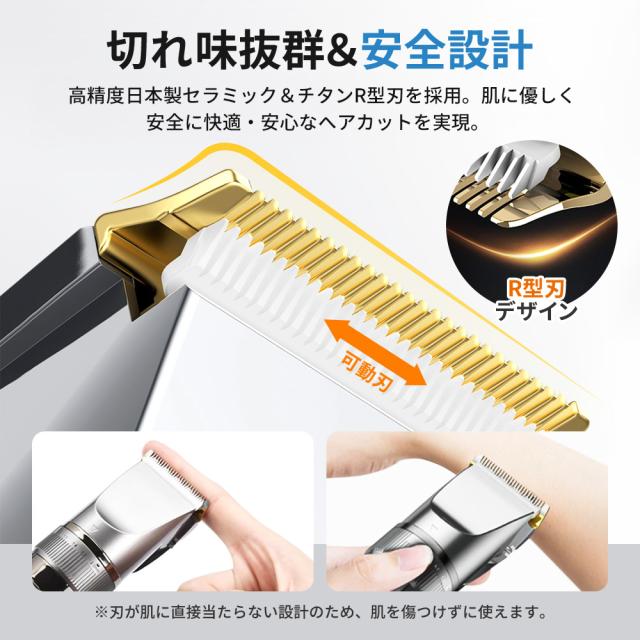 日本製のR型安全刃先設計により、スムーズなカットが可能です。初心者でもプロ並みの仕上がりが期待でき、毛量が多い方やお子様にも安心してご使用いただけます。