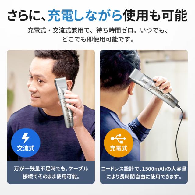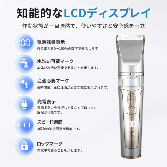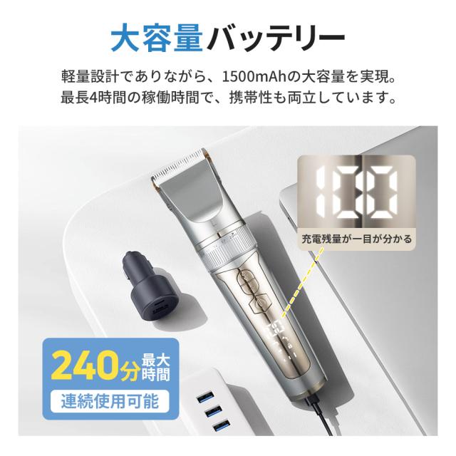 LEDディスプレイ搭載で、残量表示機能により理髪器の状態を一目で確認できます。1500mAhの大容量バッテリーで、約4時間の連続使用が可能です。コードレスで充電中も使用でき、待機時間ゼロで快適にご利用いただけます。