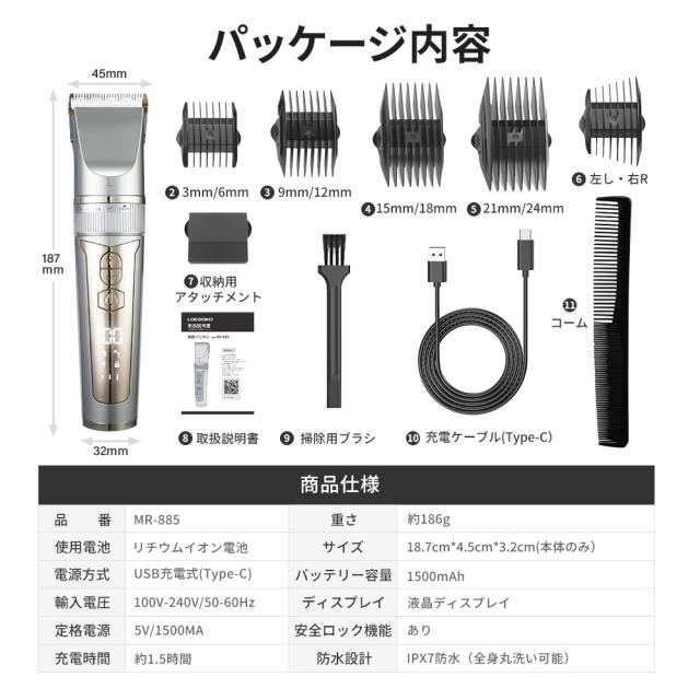 品名電気バリカン型番MR-885PRO輸入電圧100V-240V/50-60Hz消費電力最大5Wバッテリー容量高性能内蔵1500mAhバッテリーバッテリー寿命ゼロからマックスまで約500回の充電が可能です充電時間TYPE-C 急速充電で約1.5時間最大稼働時間MAX充電で最大約240分サイズ19.7cm * 4.5cm* 3.2cm(本体のみ)製品重量(本体)約186gディスプレイ液晶ディスプレイ安全ロック機能あり防水機能IPX7全身防水(丸洗い可能)保証期間最長365日(180日+レビュー投稿後の2倍延長保証特典)※レビュー投稿後、自動で延長され、連絡は不要です。梱包リスト本体*1、TYPE-C充電ケーブル*1、アタッチメント*5、刃カバー*1、掃除用ブラシ*1、コーム*1、日本語取扱説明書*1関連キーワードバリカン バリカン 散髪 ヘアカッター 電動バリカン 髭剃り 子供 家庭用 業務用 コードレス セルフカット 散髪セット IPX7防水 防水 丸洗い USB充電 TYPE-C 残量表示 超低騒音 プロ仕様 1500mAh バリカン メンズ ヒゲトリマー クリスマス プレゼント ギフト 父の日 敬老の日 バレンタイン デー 卒業式 入学式 誕生日 還暦祝い 飛行機持ち込み可能 旅行、海外持ち込みにも対応可能 |