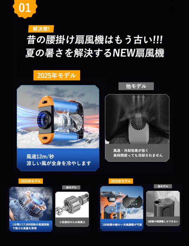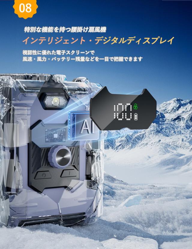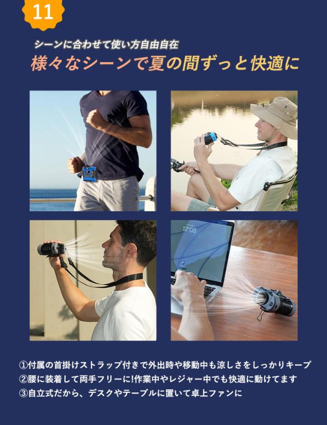 | 商品紹介 | 【首にも腰にも掛けられる♪腰掛け 扇風機】 100段階の冷風調整が可能な腰掛け扇風機です 風速12m/秒の涼しい風が、全身を冷やしてくれます 【ポイント1 「100段階」の冷風調節が可能】 100段階の細かい冷風調整が可能な腰掛け扇風機です 自分の体調によって細かく調節できるので便利です 【ポイント2 持ち運びできる】 小型デザインなので、腰掛けしたり首掛けしたりできます 腰掛けできるので、スポーツやアウトドア等にも使えて便利です 【ポイント3 静音性有り】 ブラシレスデザインなので、騒音を極力抑え静音性を実現します 低騒音なので、夜でも音を気にせず過ごす事が出来ます 【ポイント4 最大30時間のワイヤレス仕様】 大容量バッテリー搭載で、朝から晩まで快適な涼しさをキープ♪ 移動中でも、バッテリーの残量を気にせず使えます 【ポイント5 落下に強いシリコンケース付き】 輸入PC素材とシリコンを合わせているので、落下に強いです 落としたとしても、耐衝撃性があって安全 【ポイント6 モバイルバッテリーとしても使える】 USB Type-Cインタフェースがあるので、非常時にはモバイルバッテリーとしても使用可能です スマートフォンや各デバイスにも対応できて便利です |