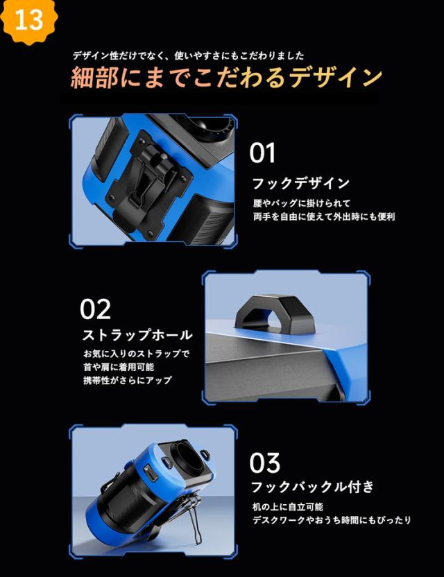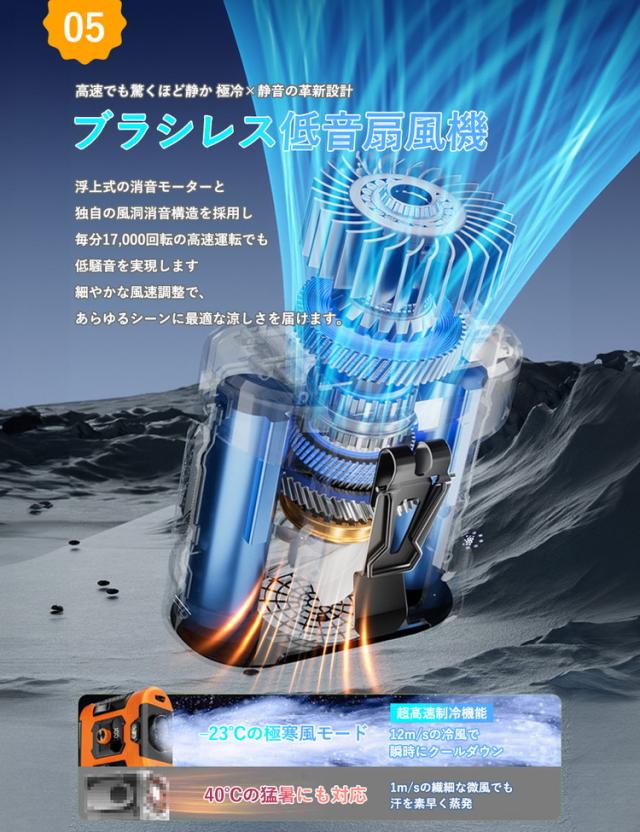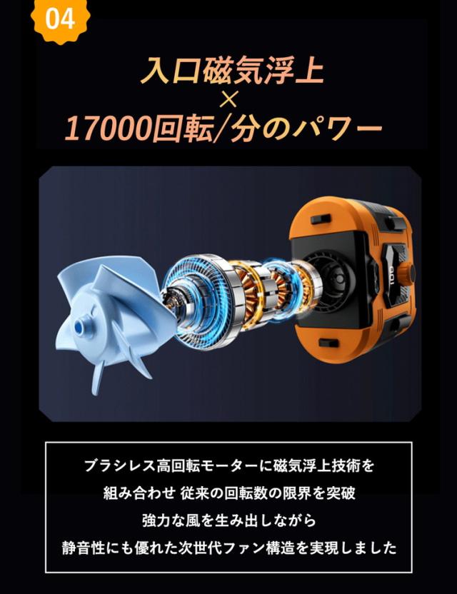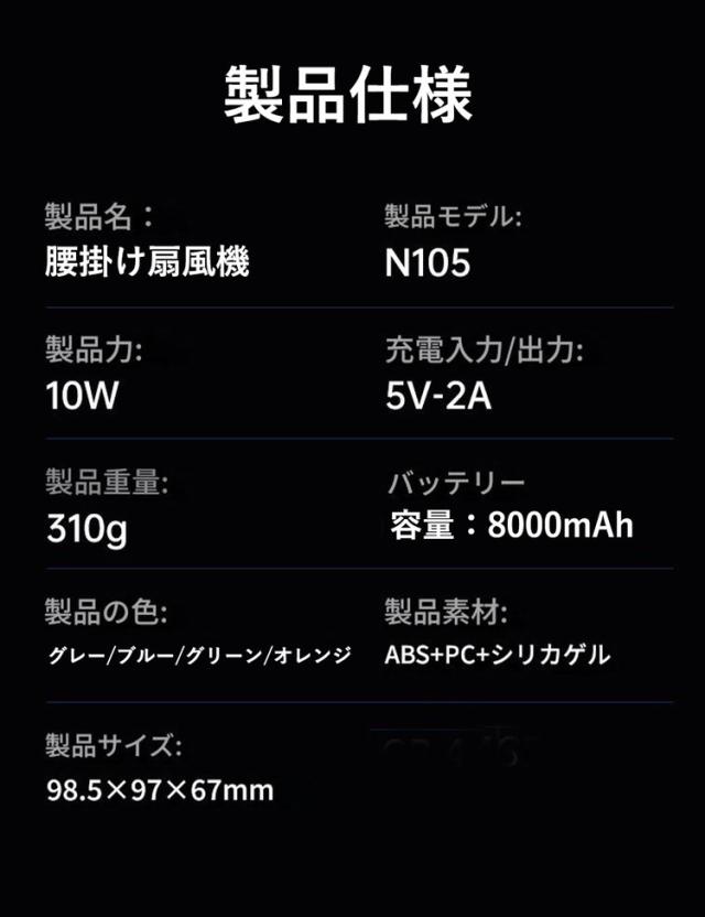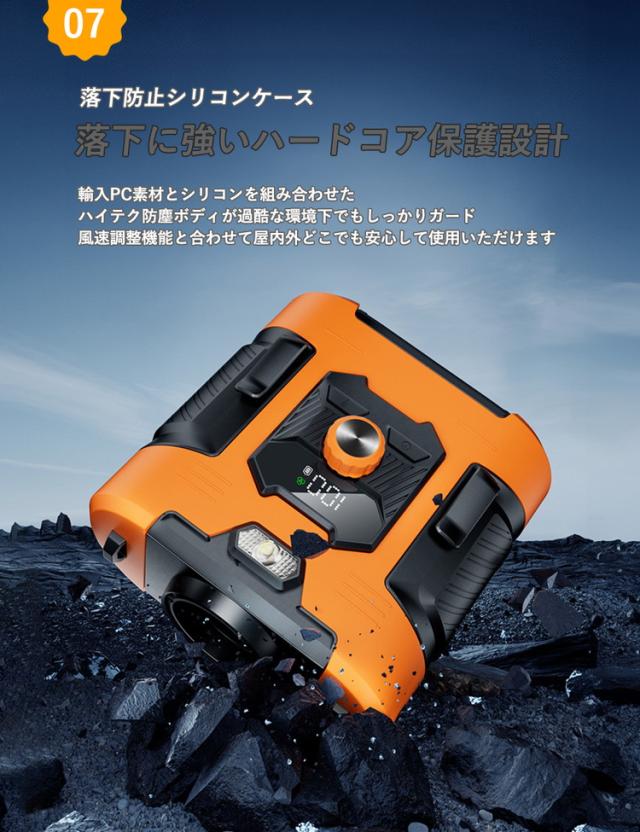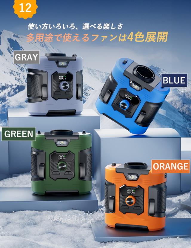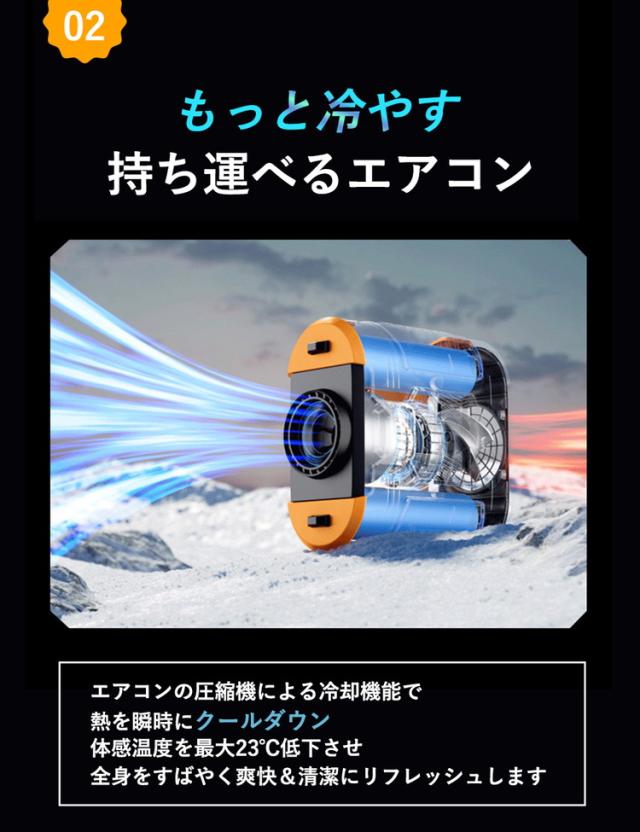 | 商品仕様 | ・「100段階」の冷風調節が可能 ・持ち運びできる ・静音性有り ・最大30時間のワイヤレス仕様 ・落下に強いシリコンケース付き ・モバイルバッテリーとしても使える |