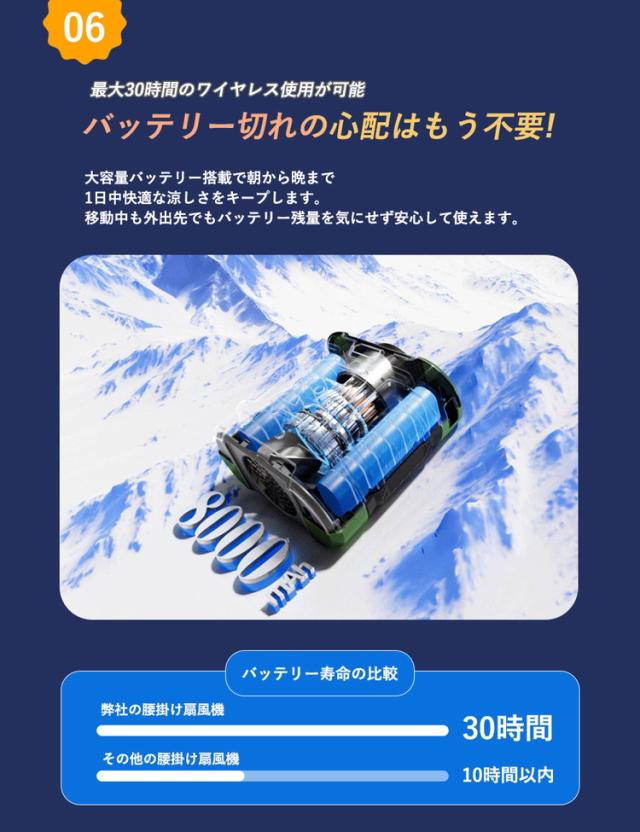 大容量バッテリー搭載で、朝から晩まで快適な涼しさをキープ♪