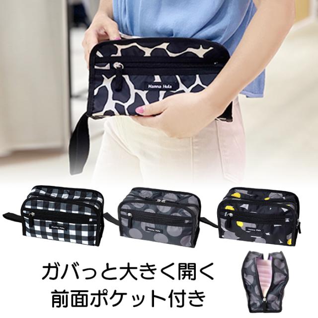 横から大きく開いて中身が見えやすい。たっぷり大容量。前面にファスナーポケット付き。スマートフォンのバッテリーなど身の回りの小物、おむつポーチ、コスメポーチ、トラベルポーチとして、細々としたものをすっきり収納。プレゼントとしてもおすすめです。