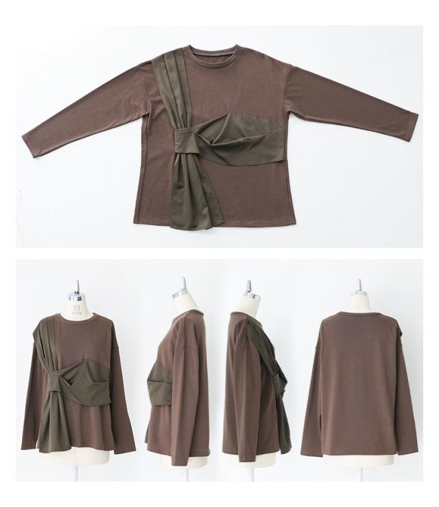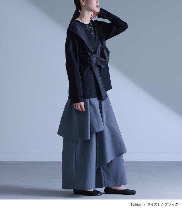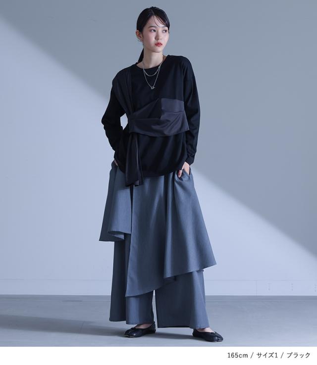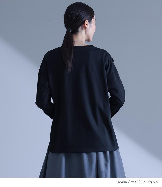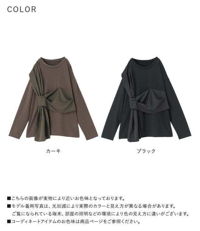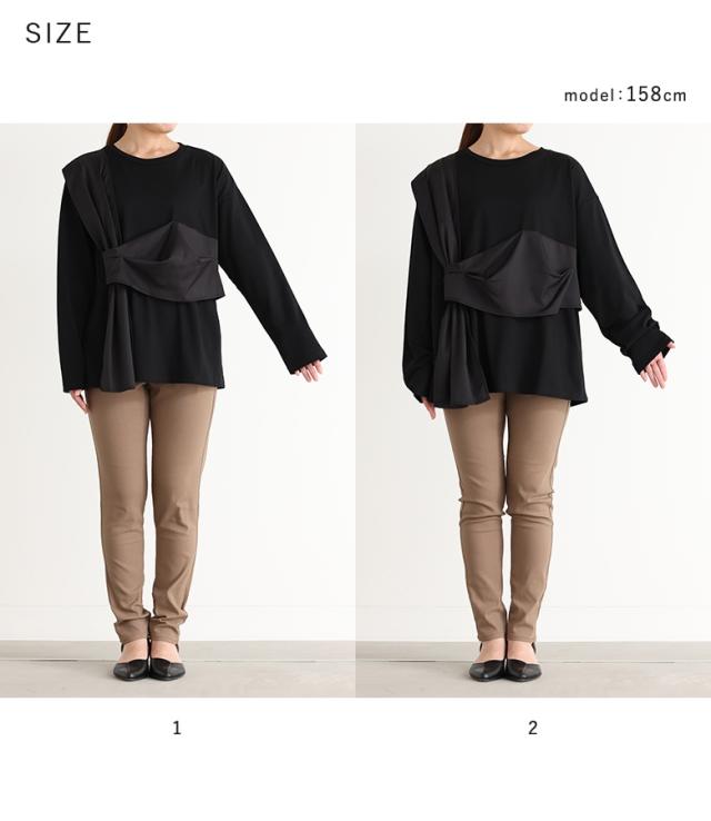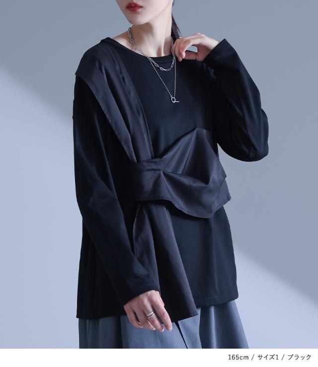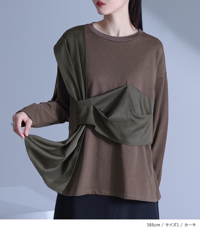 『布帛ドッキングカットソー』※メール便可※【10】[カットソー 長袖 レディース トップス ロンT クルーネック 異素材 ドッキング タック 綿混 微光沢 ゆったり 楽ちん プルオーバー 秋 春]