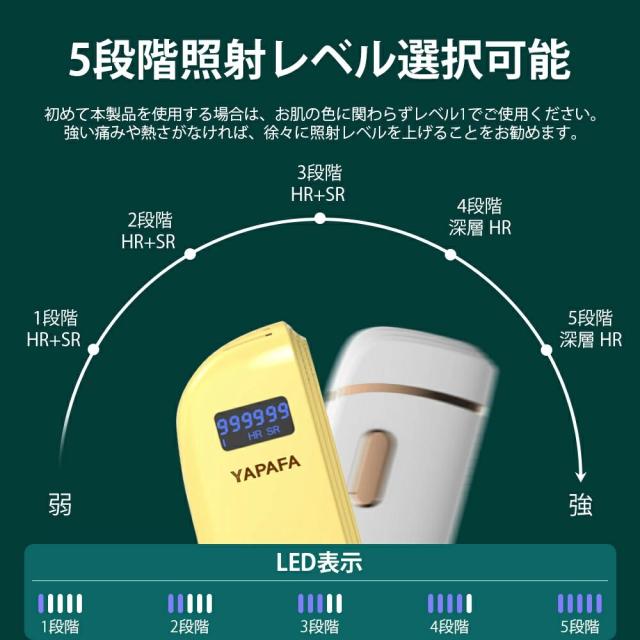 照射レベルは5段階で調整可能 なので、肌質や毛の太さに合わせた最適なケア ができます。