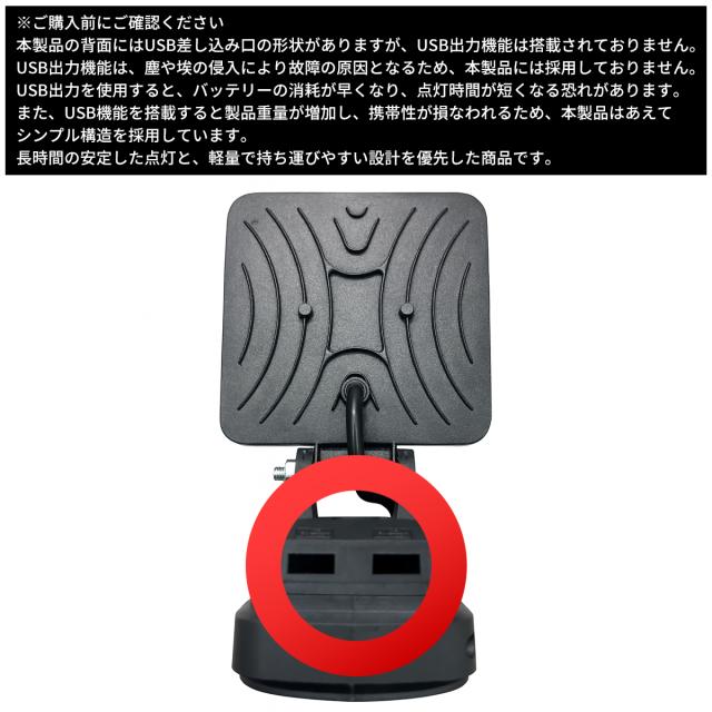 明るさ・点灯時間最優先のためUSB電源機能は備えていません。