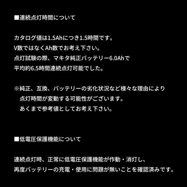 点灯試験の際、普段使用しているマキタ純正バッテリー6.0Ahで平均約6.5時間連続点灯可能でした。