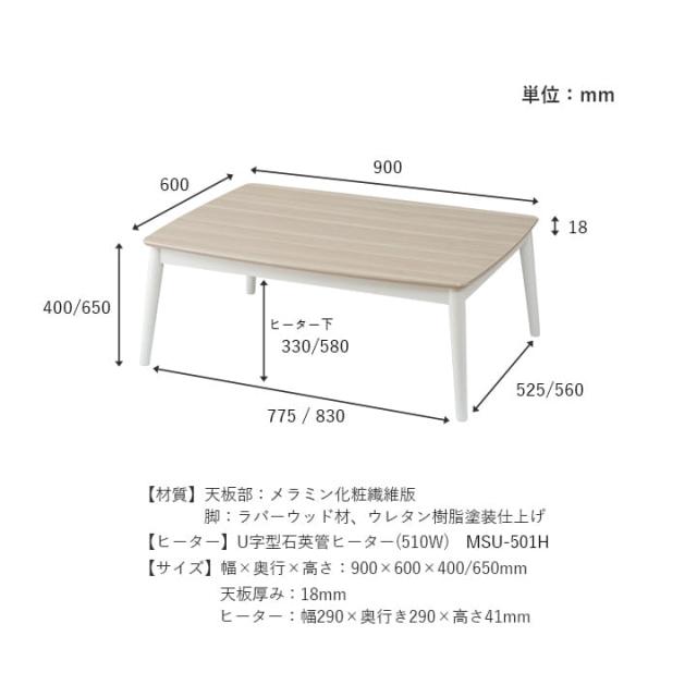 | 【台】 天板 メラミン化粧繊維版 脚 ラバーウッド材 ウレタン樹脂塗装仕上げ 【ヒーター】 U字型石英管ヒーター(510W) 電源スイッチ付きコード3m 温度ヒューズ、無段階温度調節機能 サーモスタット内蔵 |
