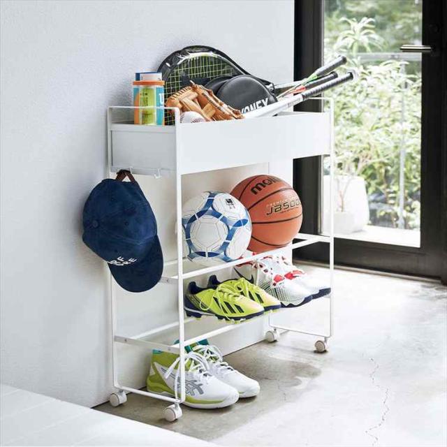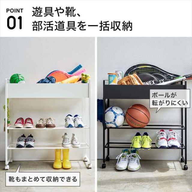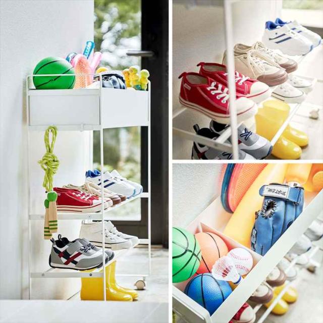 お子様の遊具や靴、ボールなどを玄関にスッキリ収納できるキャスター付き収納ラックです。小さな子供から大人まで長い期間成長に合わせて使用できる収納ラック。ボールやラケットの収納にもピッタリ。プランターやガーデニング用品の収納にも。