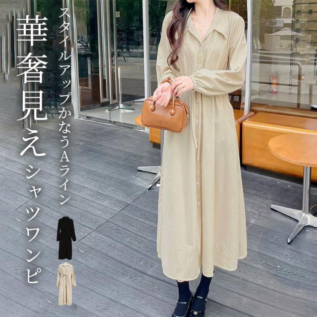「ドレープ風に仕立てる」シャツワンピース 長袖 きれいめ レディース ゆったり ロングワンピース コーデュロイ Aライン オープンカラー 前開き ボタン ギャザー ウエストリボン ポケット セットインスリーブ 袖口ゴム 薄手 無地 春秋 黒