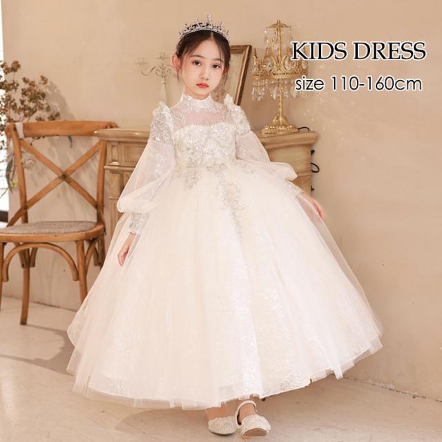 キッズ ロングドレス 子供ドレス 女の子 ホワイト長袖 ハイネック ピアノ 発表会 演奏会 結婚式 フォーマル ジュニア 子どもドレス 誕生日 パーティー 記念写真撮影 上品 刺 エレガント 女児