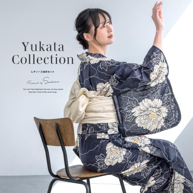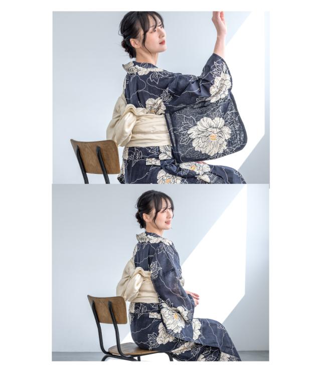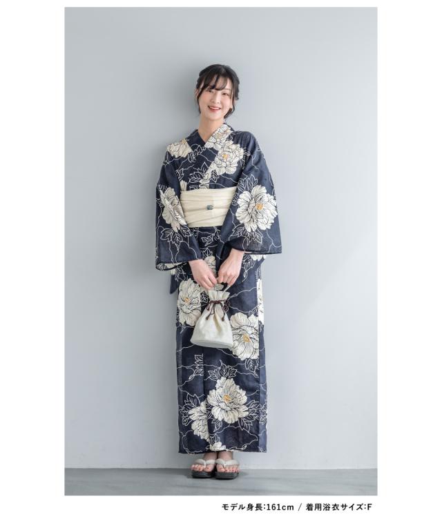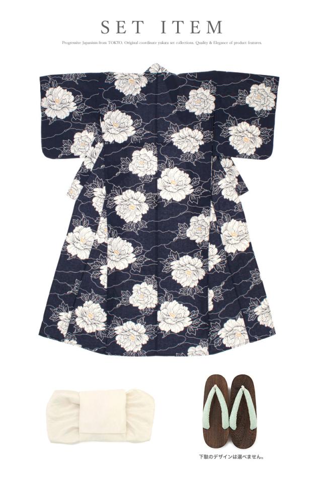 浴衣 セット レディース 浴衣セット 兵児帯 2025新作 3点セット 簡単 涼しい 紺 白 牡丹 レトロ 花柄 フラワー 綿麻 大人 おしゃれ トレンド 帯 下駄 S フリー 送料無料