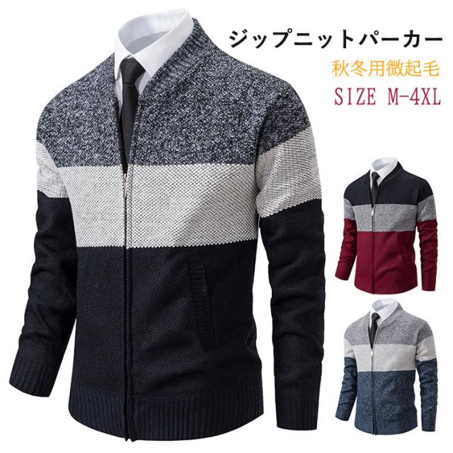 メンズ ジップアップニットパーカー ジップアップニットセーター 立ち襟 ハイネックニット ニットジャケット 男性 厚手 長袖 裏起毛 セーター 防寒 トップス ビジネス 通勤 M-4XL 3色 秋冬