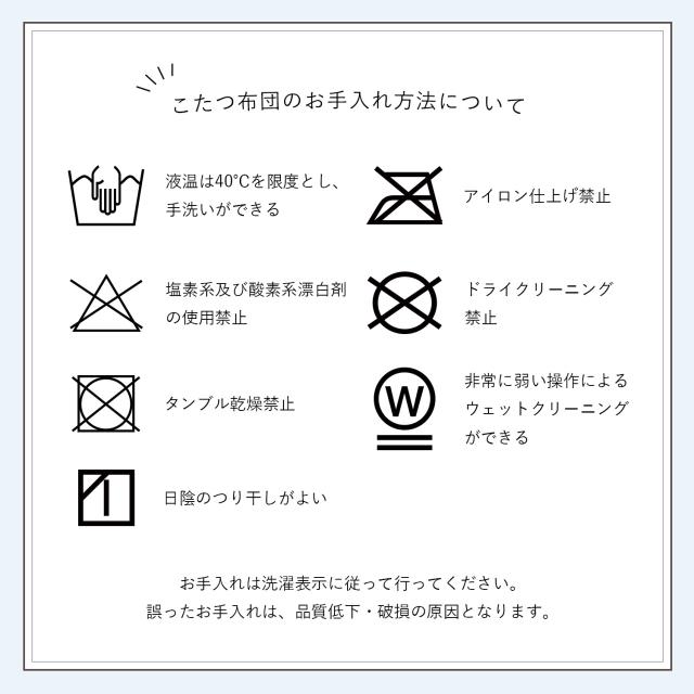 | 液温は40℃を限度とし、手洗いができる。(洗濯機は使用できません) 干し方=日陰のつり干しがよい。 |