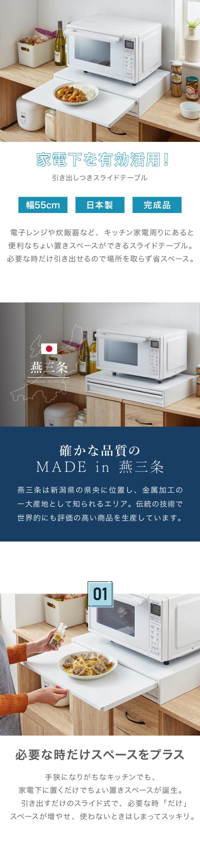 日本製 燕三条 収納付き キッチン家電下 スライドテーブル 幅55cm 2way 家電下 スライドテーブル 炊飯器 電子レンジ 下 引出し 引き出し 収納 レンジラック トースター台 レンジ台 完成品(代引不可)【送料無料】