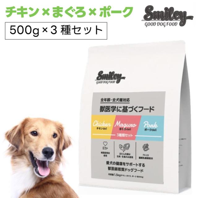 Smiley スマイリー 3種類セット1.5kg チキン まぐろ ポーク 500gx3個 ドッグフード 犬 餌 国産 無添加 減塩 ノンオイルコーティング 低GI