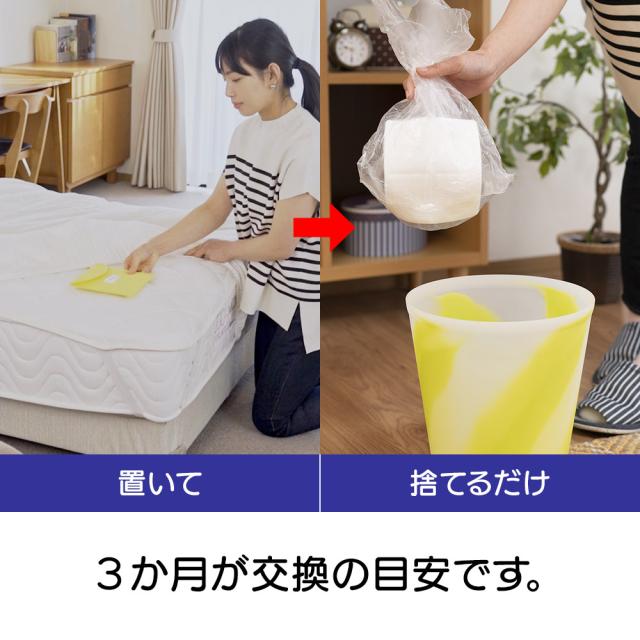 3か月間、気になる箇所にダニ捕りロボを設置してください。誘引マットにダニが集まります。使用後は誘引マットを取り出し、ゴミ袋に入れて燃えるごみとして処分してください。製品内のダニは、乾燥させて閉じ込めるので安心です。