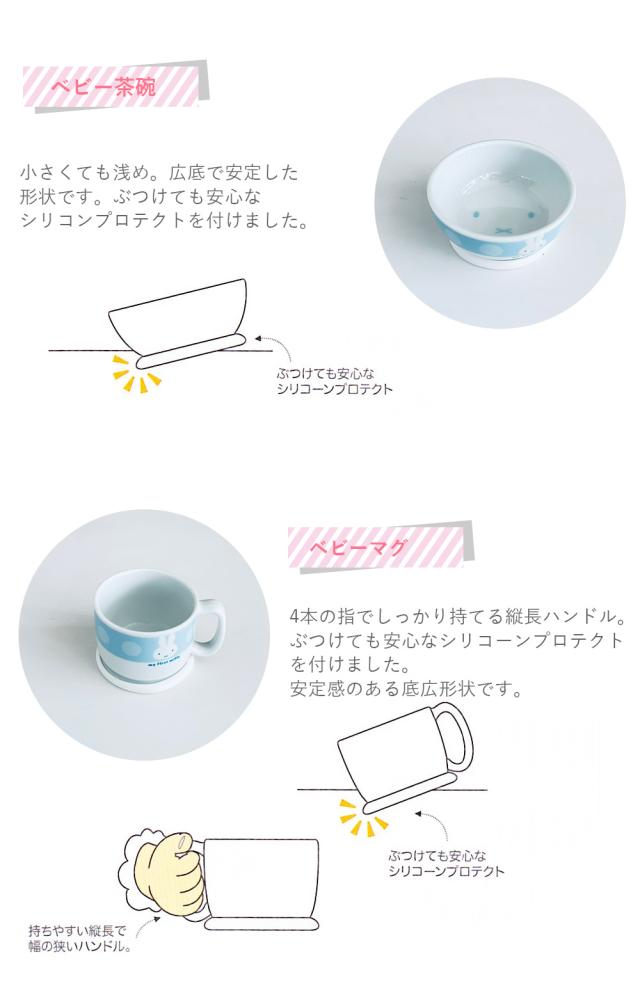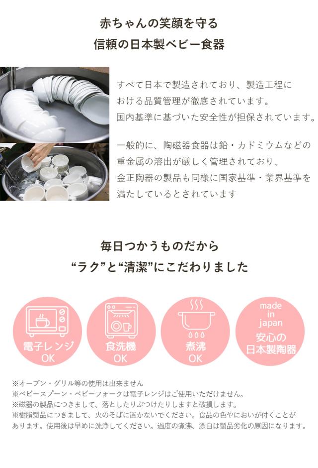 ●磁器(ベビーランチ皿、ベビーマグ、ベビー茶碗)、シリコーンゴム(ベビーマグとベビー茶碗のプロテクトパーツ)、ステンレス(スプーン・フォーク)