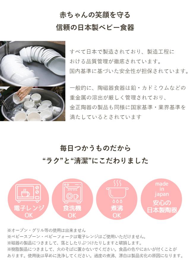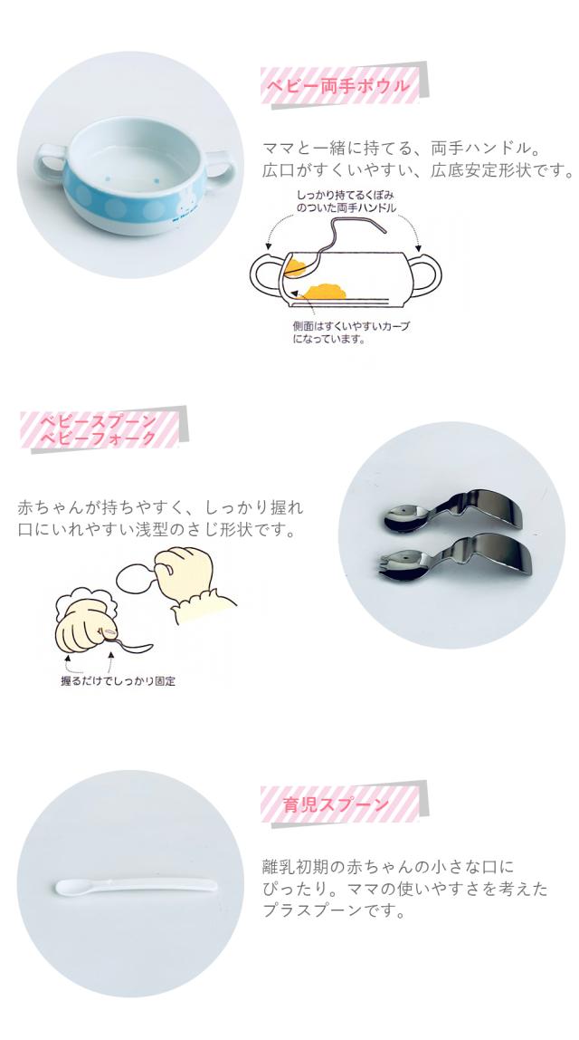 ●磁器(ベビーボウル、ストロー両手マグ、ベビー両手ボウル、ベビートレイ、ベビー深皿)、ポリプロピレン(育児スプーン)、ステンレス(スプーン・フォーク)