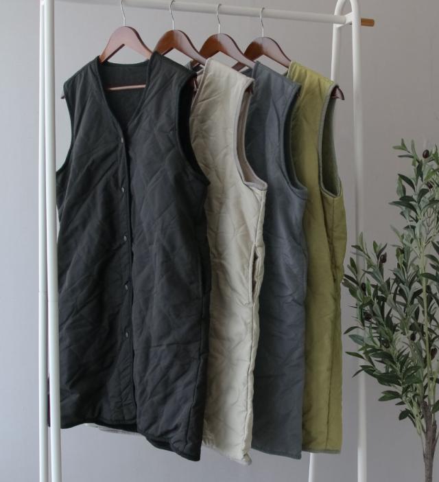 裏シャギーで軽くてあたたかい撥水キルトベスト。さっと羽織れてお洒落に寒さ対策できます!かわいいひょうたん型のステッチ。コートではまだ早く肌寒い時に羽織れば、ロング丈でお尻まですっぽり隠れるのであたたか◎アウトドアにもおすすめです。