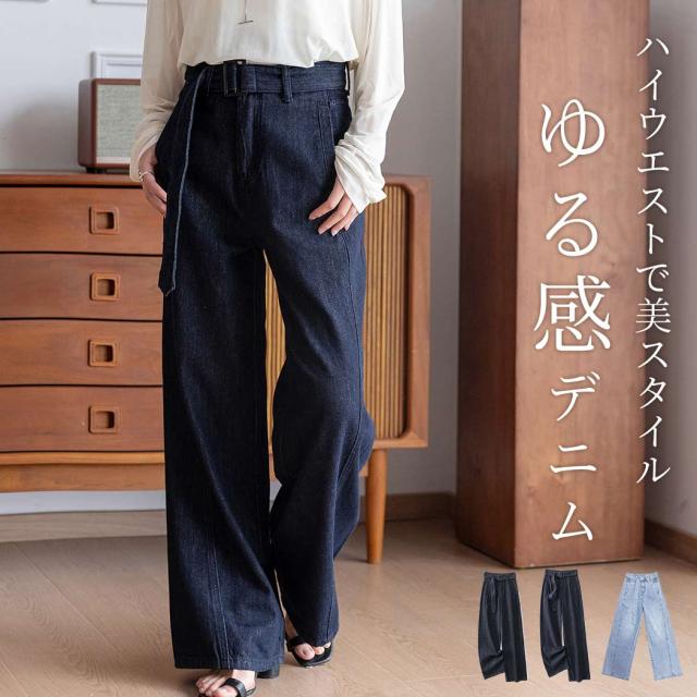 「美ゆるっとシルエット」ワイドパンツ デニム レディース ゆったり きれいめ ベルト付き ジーパン ボトムス ロングパンツ ハイウエスト ポケット ボタン ファスナー ベルトループ 着痩せ 中厚手 無地 韓国ファッション デイリー 黒 春夏 秋冬