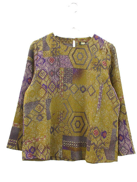 【中古】詩仙堂 ゴールドレーベル ちりめん 縮緬 ブラウス トップス イエロー系 プリント 総柄 長袖 レディース