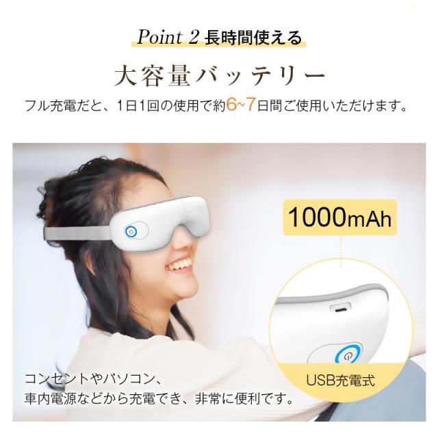 温熱機能も搭載しており、40℃前後の熱でしっかりと目元を温め、疲れを癒やしてくれます。
