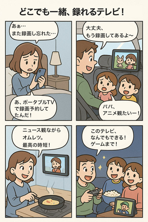 自宅のキッチン、車中泊、アウトドア、ベッドサイド。 場所も電源も選ばないこの一台が、あなたの映像体験を一気にアップグレードします。