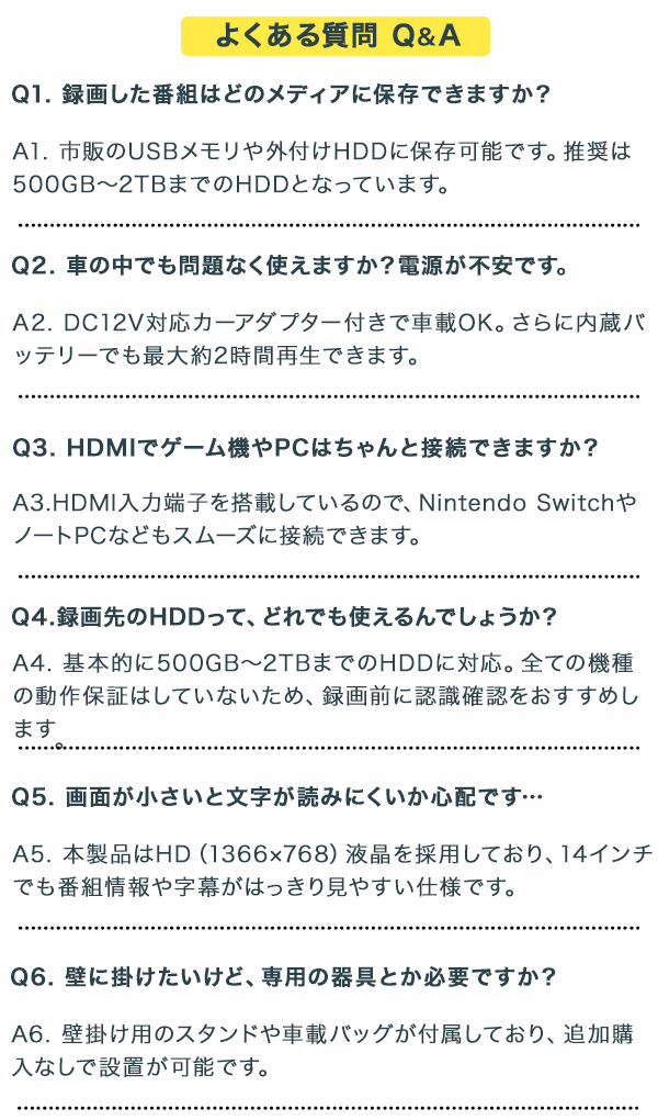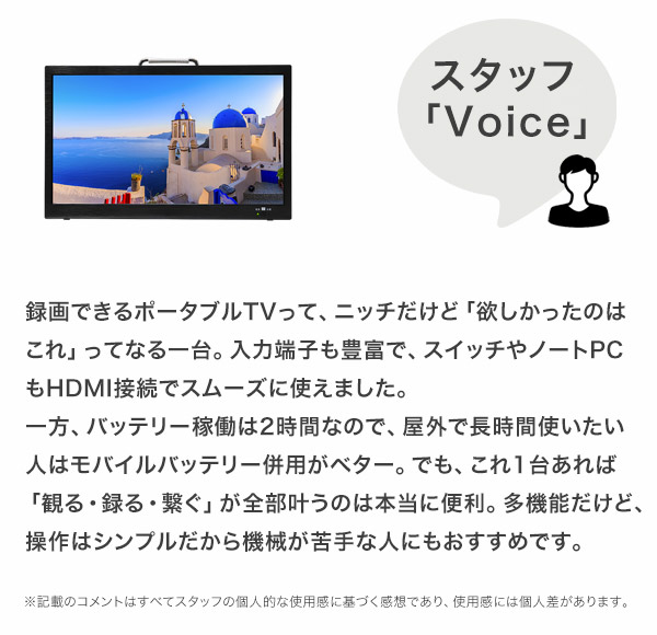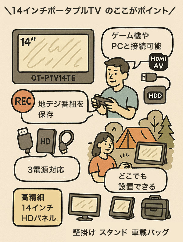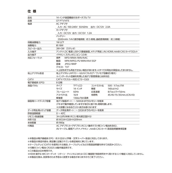 【録画もゲームもこれ1台】14インチ録画機能付きポータブルTV OT-PTV14TE 「ポータブル=映すだけ」なんて、もう古い。 録って、遊んで、どこでも観られる。そんな"全部入り"を探してた人に、まさにコレ。 自宅のキッチン、車中泊、アウトドア、ベッドサイド。 場所も電源も選ばないこの一台が、あなたの映像体験を一気にアップグレードします。 \OT-PTV14TEのここがポイント/ ■ HDMI・AVの2系統入力でゲーム機やPCとも接続OK ■ 録画対応!USBメモリ・HDDで地デジ番組を保存できる ■ AC・DC・内蔵バッテリーの3電源仕様 → 車載やアウトドアにも◎ ■ 壁掛け・スタンド・車載バッグで設置フリー ■ 14インチHDパネルでポータブルでも高精細 注目ポイント1:録画できるポータブルTV、って地味に最強 USBメモリやHDDをつなぐだけで、地デジ番組の録画が可能。 「出先で番組を録り逃したくない」「キャンプで子どもにアニメを見せたい」なんて希望にも、しっかり応えます。 ファイル再生機能も充実。MP4動画から音楽ファイル、JPEG画像まで対応。 旅先でも“いつものコンテンツ”が楽しめます。 注目ポイント2:3WAY設置で、使い方はあなた次第 壁掛け・スタンド・車載バッグの3スタイルに対応。 キッチンでは壁に掛けて料理中にニュースをチェック。 寝室ではスタンド置きで寝落ちのお供に。 ドライブ中は車載して、子どもたちのぐずり対策に。 「どこにでも置ける」って、思った以上に自由です。 注目ポイント3:3電源対応。コンセントがなくても心配無用 AC電源はもちろん、DCアダプターで車内使用OK。 そして、内蔵バッテリー(2500mAh)でも最大約2時間の再生が可能。 アウトドアや災害時の備えとしても活躍します。 ※フル充電には約5時間かかります。 注目ポイント4:HD解像度&14インチの高精細パネル コンパクトながらも、画質に妥協なし。 HD(1366×768)液晶を搭載し、地デジや動画再生でも文字が見やすい。 HDMI接続でゲームも快適。サブモニターとしても活用できます。 注目ポイント5:端子が豊富だから、"使える幅"が広い HDMI、AV、USB(2口)、miniB-CAS、アンテナ入力…これだけ揃っていれば、大抵の機器に接続OK。 リモコンも付属しており、ベッドから操作もラク。 録画先は500GB〜2TB(※推奨)対応で、録り溜めも余裕です。 実際に使ってみたレポート 車中泊で使用。出発前に子どもが見たい番組をUSBに録画しておき、移動中はアニメを再生。 夜はスタンドで立てて映画鑑賞。 「正直、ポータブルTVってここまで進化してるのか…」と驚きました。 【スタッフVoice】 録画できるポータブルTVって、ニッチだけど「欲しかったのはこれ」ってなる一台。 入力端子も豊富で、スイッチやノートPCもHDMI接続でスムーズに使えました。 一方、バッテリー稼働は2時間なので、屋外で長時間使いたい人はモバイルバッテリー併用がベター。 でも、これ1台あれば「観る・録る・繋ぐ」が全部叶うのは本当に便利。 多機能だけど、操作はシンプルだから機械が苦手な人にもおすすめです。 ※記載のコメントはすべてスタッフの個人的な使用感に基づく感想であり、使用感には個人差があります。 こんな人におすすめ! 「録画機能付きの持ち運べるTVが欲しかった」という人 地デジ・ゲーム・動画再生を1台で済ませたい人 車中泊やアウトドアでもテレビや動画を楽しみたい人 「どこでも映せる」から、「どこでも録れて楽しめる」へ。 ただのモニターに満足できないあなたにこそ、この一台が応えてくれます。まずは一度、使ってみてください。 ?? 製品サイズ・重量 ・外形寸法:約 幅334 × 奥行28 × 高さ209mm ・本体重量:約980g(約1kgで持ち運びもラク) ?? 電源・バッテリー 【ACアダプター】 ・入力:AC100V〜240V(50/60Hz対応) ・出力:DC12V / 2.0A 【カーアダプター】 ・入力/出力:DC12V / 1.2A 【内蔵バッテリー】 ・容量:2500mAh / 7.4V ・充電時間:約5時間 ・連続使用時間:約2時間 ?? 消費電力 ・通常時:約18W ・待機時:1W以下(省エネ設計) ?? オーディオ ・内蔵スピーカー:ステレオ(3W+3W) ・イヤホン端子:3.5mmミニジャック ?? 入出力端子 ・入力:アンテナ端子、DC電源、USBポート×2(録画/再生用)、AV入力、HDMI入力、miniB-CASカードスロット ・出力:イヤホン端子(3.5mm) ?? 映像・ディスプレイ ・液晶タイプ:TFT-LCD(14インチ) ・解像度:1366×768(HD) ・アスペクト比:16:9 ・リフレッシュレート:60Hz ・コントラスト比:500:1(Typ.) ・輝度:140cd/m2 ・応答速度:8ms(Tr+Td) ・視野角:左右45° / 上15° / 下35° ?? 放送・チューナー ・地上デジタルUHF:13〜62ch(フルセグ/ワンセグ自動切替) ・CATV:パススルー対応(C13〜C63) ・電子番組表(EPG):8日分表示対応 ※インターネット経由での地デジ受信には非対応 ?? 対応メディア・フォーマット 【録画メディア】 ・推奨:500GBまでのUSBハードディスク ・動作確認済み:最大2TB(※大容量はリスト表示に時間がかかる場合あり) 【再生用メディア】 ・推奨:USBメモリ〜32GBまで 【再生対応フォーマット】 ・音声:MP3、WMA、WAV、AAC ・動画:MP4、MPEG-PS、WMV、AVI、3GP ・画像:JPEG、BMP ・テキスト:TXT ※