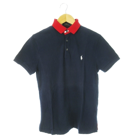 【中古】ポロ ラルフローレン POLO RALPH LAUREN ポロシャツ 半袖 コットン 鹿の子 ポニー刺繍 バイカラー S 紺