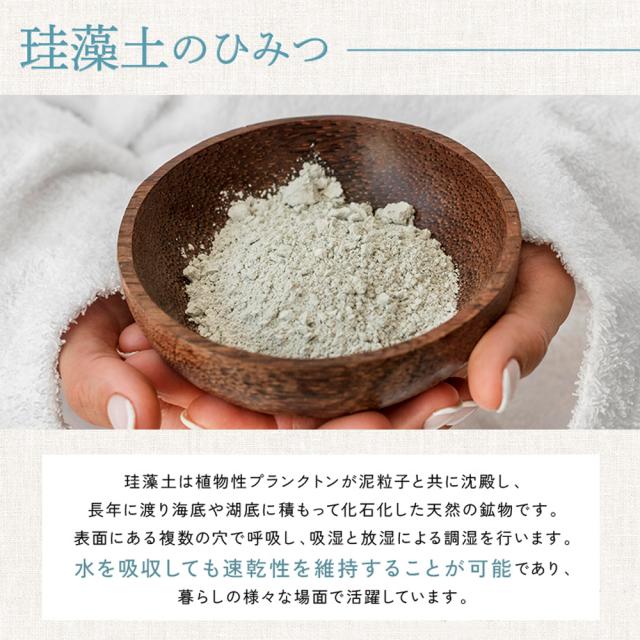 | お手入れ方法 | 汚れを落とすときは、柔らかいスポンジ等でなでるように洗うことを推奨しております。 ※強くこすると表面の珪藻土を傷つける恐れがあります。ご注意ください。 乾かす際は、通気性のよい場所に室内干しをお願いします。 |