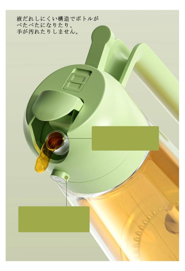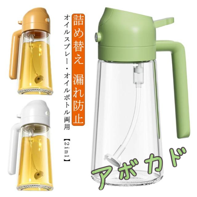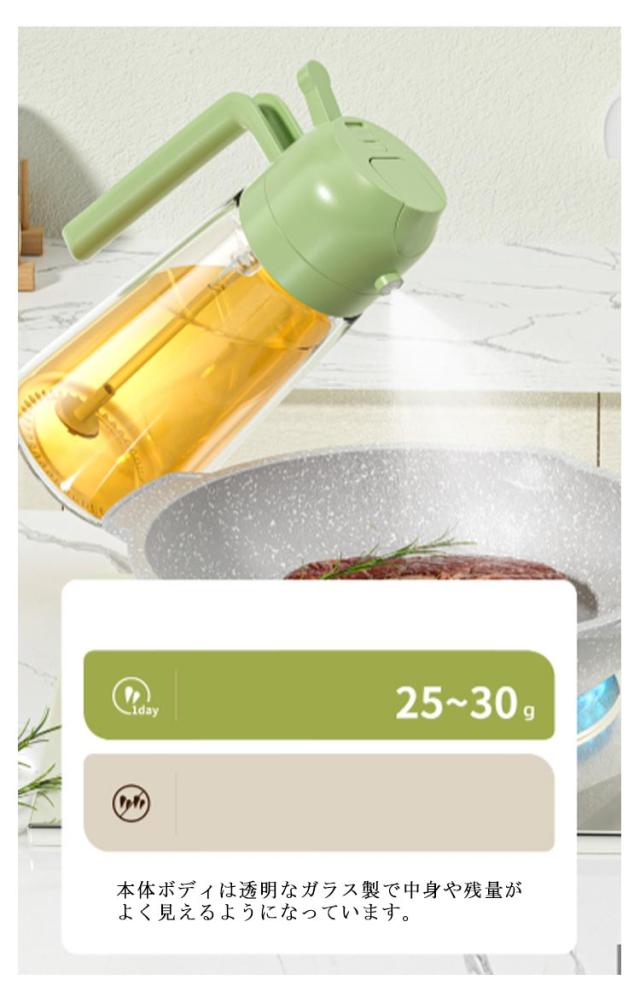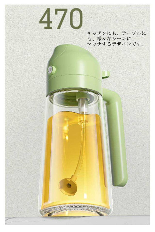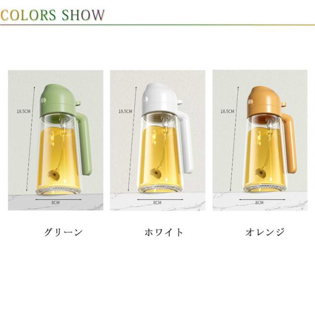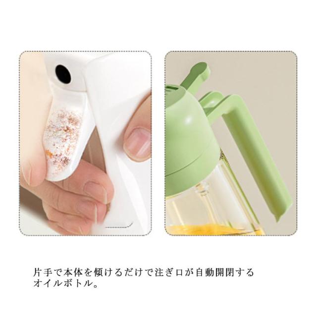 | オイルスプレー・オイルボトル両用 【2in1】 オイルボトルとしてだけではなくオイルスプレーとしても使える便利な詰め替え用調味料ボトル。 片手で本体を傾けるだけで注ぎ口が自動開閉するオイルボトル。 本体ボディは透明なガラス製で中身や残量がよく見えるようになっています。 キッチンにも、テーブルにも、様々なシーンにマッチするデザインです。 | |