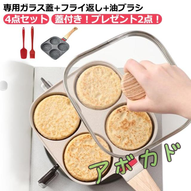 | 【4点セット】 【専用ガラス蓋*フライ返し*油ブラシ】 4つの穴が付いているので、4種類の料理を同時に調理できるから、忙しい朝の時短に。 専用ガラス鍋蓋も付属しているから、調理時間がもっと短めにでき、省エネ。 ふっ素加工が施されており、焦げ付きにくく、使用後のお手入れも簡単です。 IH コンロ セラミックヒーター ガス電磁コイル熱源を選ばず幅広くお使いいただけます。 シリコンフライ返し、油ブラシも付属しているから届いてからすぐ使えます。 | |