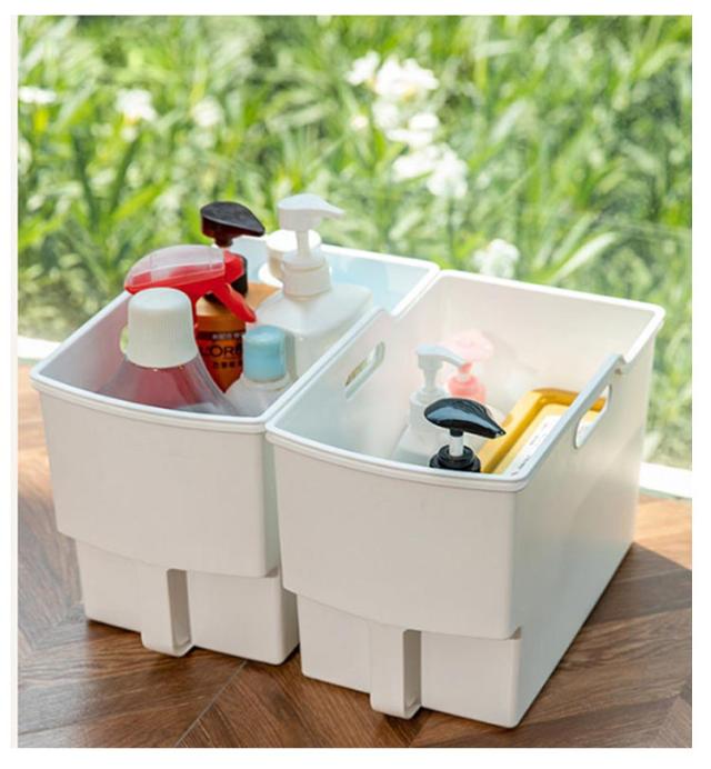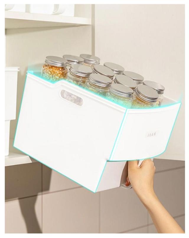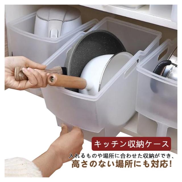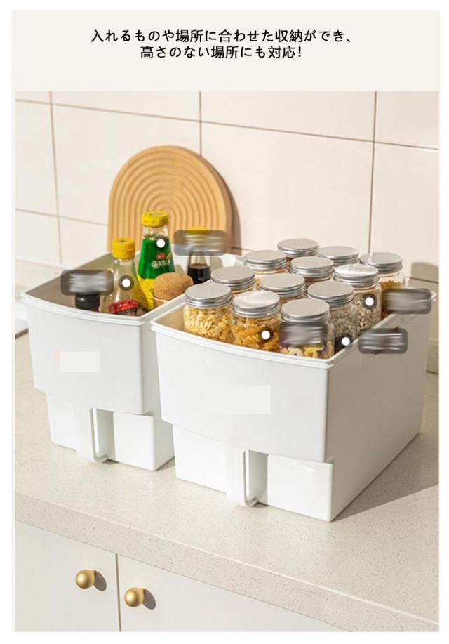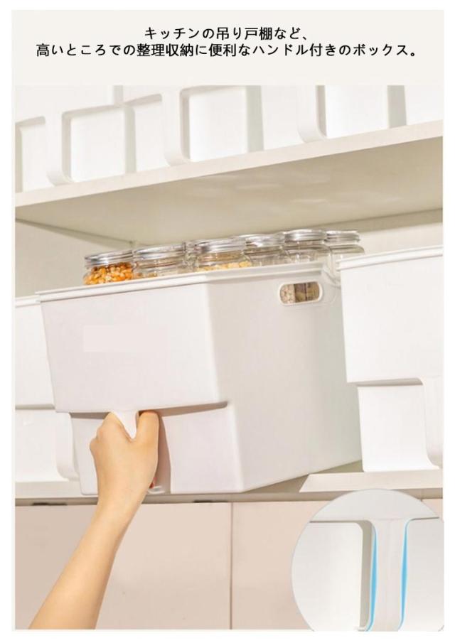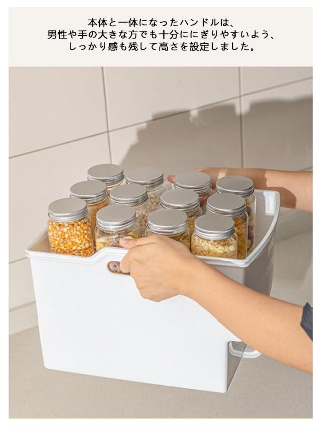 | キッチンの吊り戸棚など、高いところでの整理収納に便利なハンドル付きのボックス。 本体と一体になったハンドルは、男性や手の大きな方でも十分ににぎりやすいよう、しっかり感も残して高さを設定しました。 入れるものや場所に合わせた収納ができ、高さのない場所にも対応! 中身が丸見えにならないよう、オフホワイト色を追加、優しい雰囲気と清潔感を演出します。 ワイドな横幅は、保存容器やお弁当箱など、かさばるものもすっぽり収めることができます。 また、ハンドルがしっかりしていて幅があるので、コーヒーセットや、食器などの収納にも活躍します。 | |